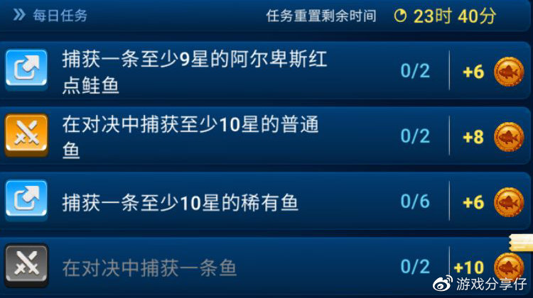 推进通行证等级的方法也很简单,只需要每天按照界面内的任务去完成就好,这些任务包括了比如“在对决中捕获一条鱼”、“捕获一条至少十星的稀有鱼”等等,其实也都可以在日常的垂钓中完成。