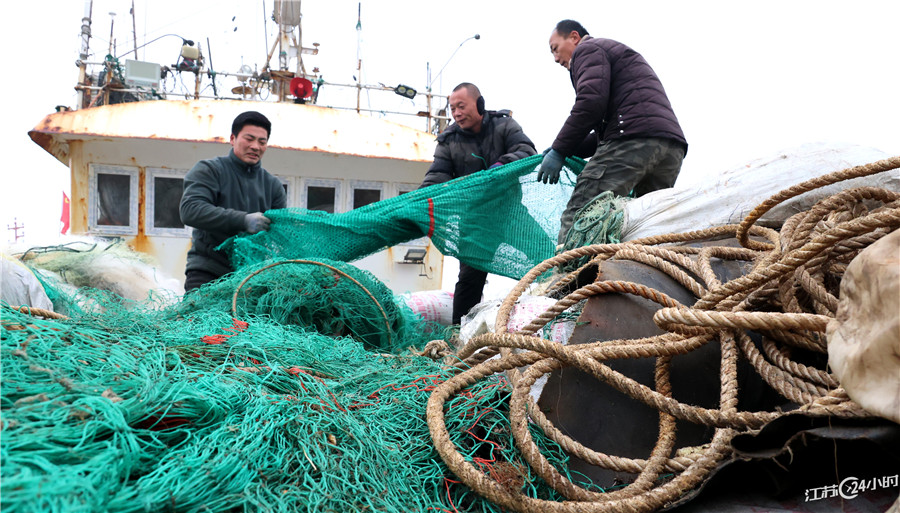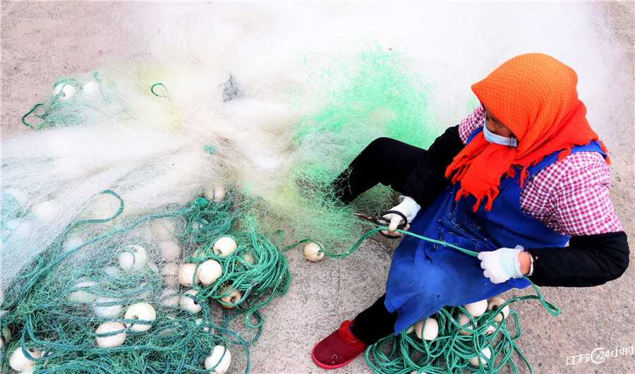 2月8日,连云港市赣榆区青口镇下口村,渔民在修补渔网。连日来,连云港市沿海渔民加紧进行修整渔船、修补渔网渔具、补充给养,为即将到来的春捕做好充分准备。特约摄影 耿玉和
