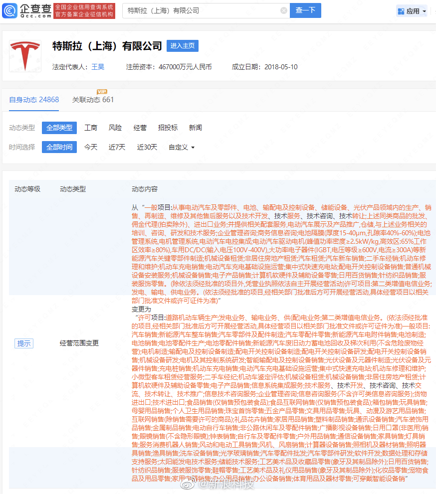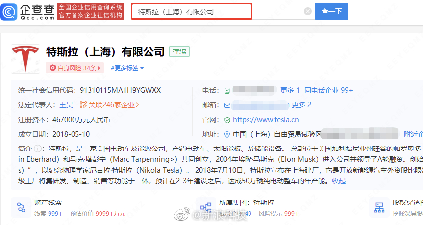 企查查显示,特斯拉(上海)有限公司成立于2018年5月,法定代表人为王昊,注册资本46.7亿元人民币,由特斯拉汽车香港有限公司全资控股。