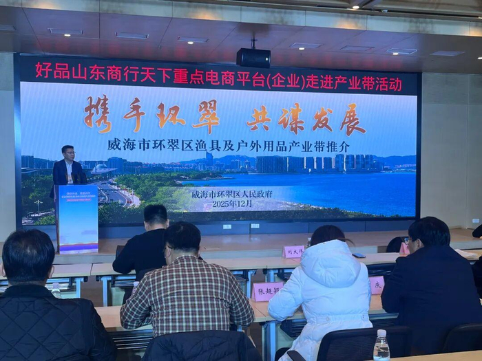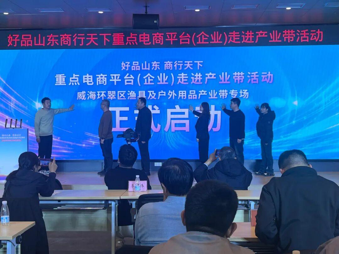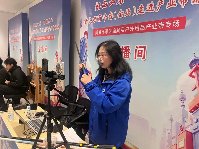 “这款威海产的路亚竿,轻量高碳材质,抛投性能出色,现在直播间下单立享专属优惠!”近日,威海市政务服务中心1号会议室外的直播间里,主播正热情推介渔具产品;室内,“好品山东 商行天下”重点电商平台走进产业带活动——威海环翠区渔具及户外用品产业带专场同步开启,政企代表与电商平台负责人齐聚,共话产业发展新机遇。